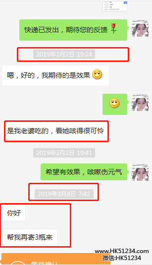 他看完说明书后爽快的下单了,快递发出不到一个星期,大早在微信留言,让我再寄三瓶太和洞久咳丸。问他吃了有效果吗,回答说有点效果。毫不犹豫的回购,加只言片语的反馈,表明了他对太和洞久咳丸效果的认可!
