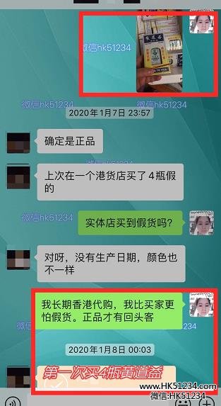 我的另一个购买黄道益的顾客,他说在别的港货店买到4瓶假的,自从在我这买过之后,就一直找我买了。这位顾客朋友在不到一年的时间里,先后多次累计买了四十多瓶黄道益。买给自己、家人,也帮朋友买。特别是后来帮他学车的师傅买,十瓶十瓶的买。他说学车师傅的老妈全身痛,一定要用这个才会止痛,只有这个有效果。