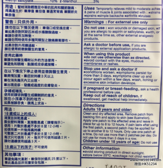 清洁并擦干患处, 撕去膏贴的塑料薄膜, 直接将膏药贴于患处。1片贴于患处8至12小时,不要超过12小时。如使用第一片后仍然疼痛, 可继续贴第2片,同样贴于患处不超过12小时, 每天使用不可超过2片, 请勿连续使用超过3天。 18岁或以上的成人使用,18岁以下的孩子不可使用。